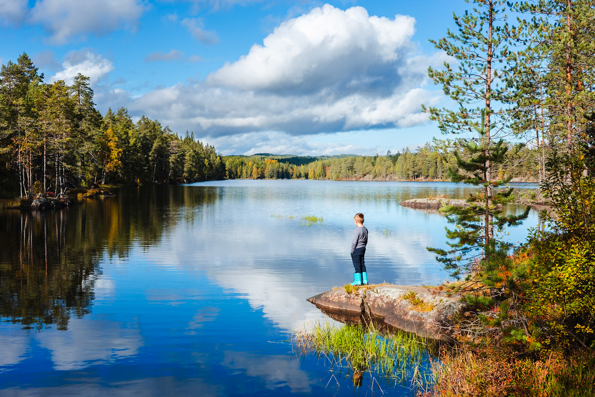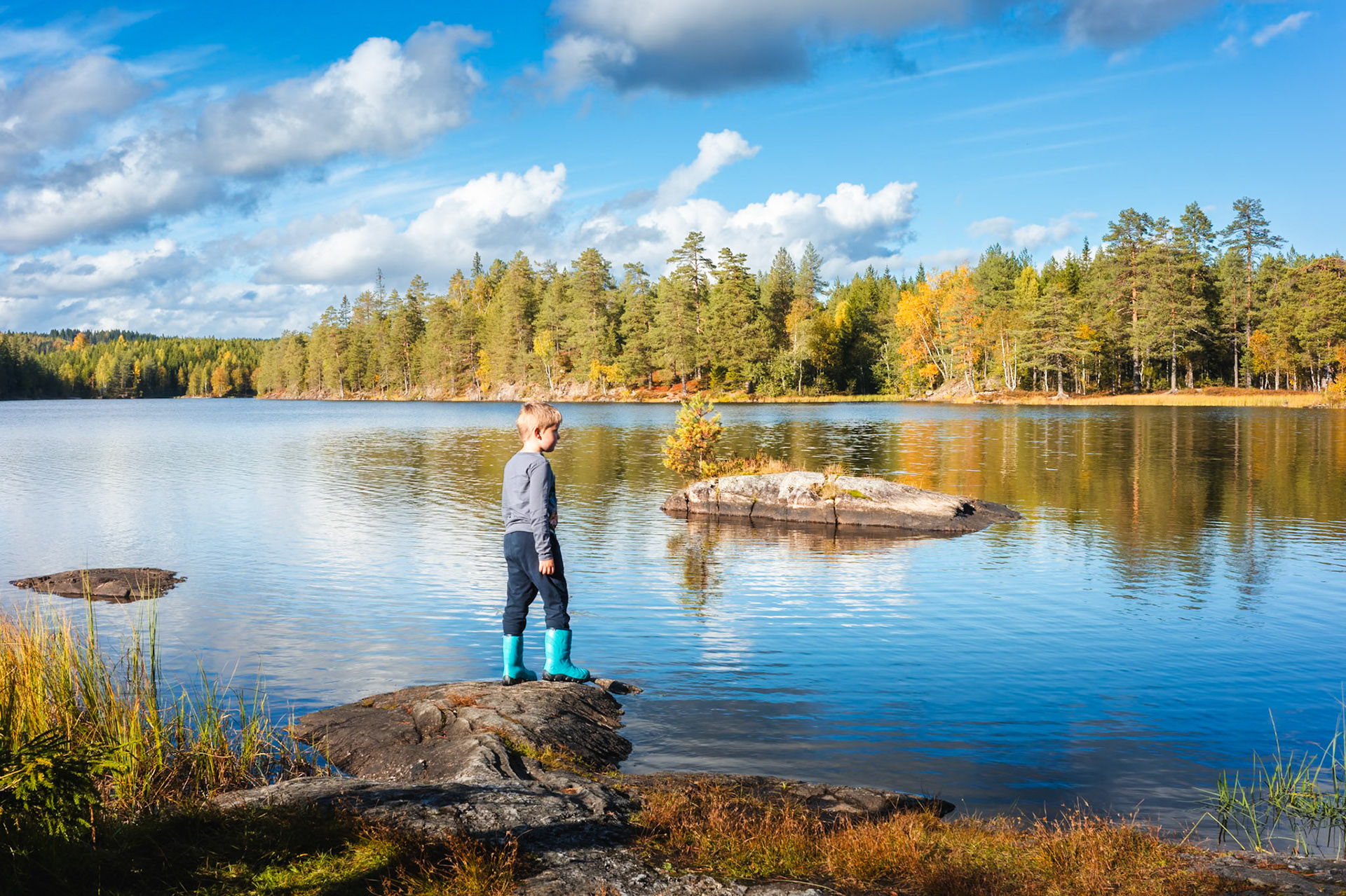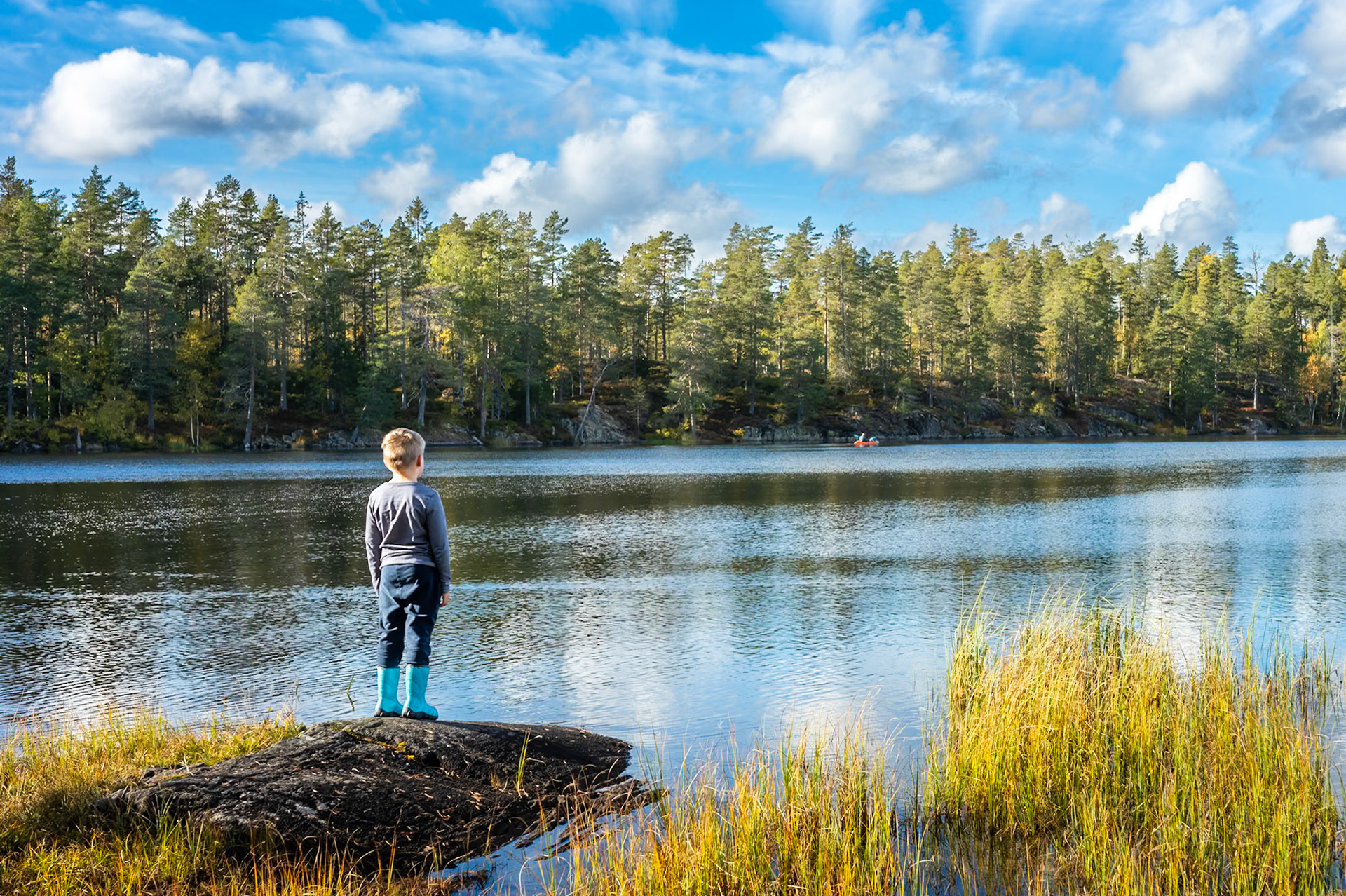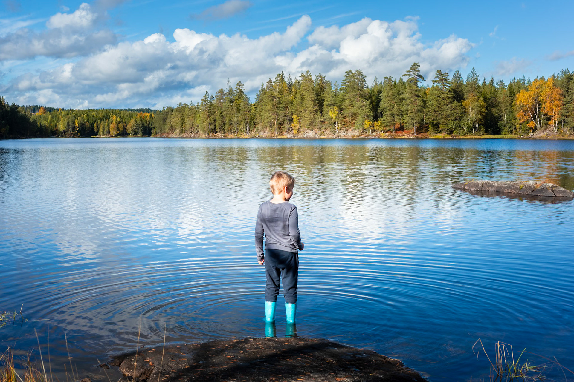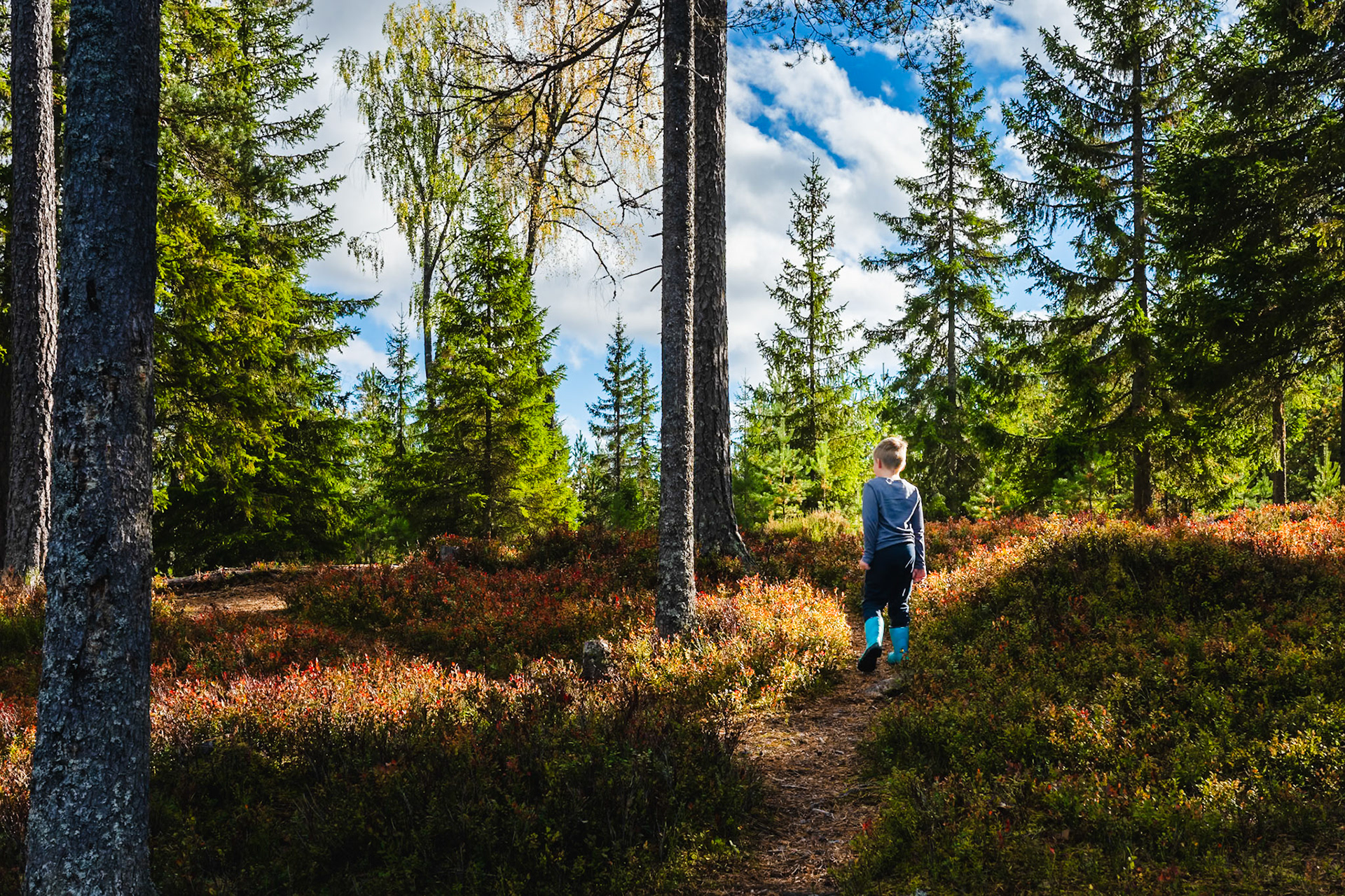 Høsten er her igjen med sine farger. Det er lett å se hvem av ungene som er mest glad i å gå på tur i skogen. Han svikter aldri. Selv når han blir våt på bena.